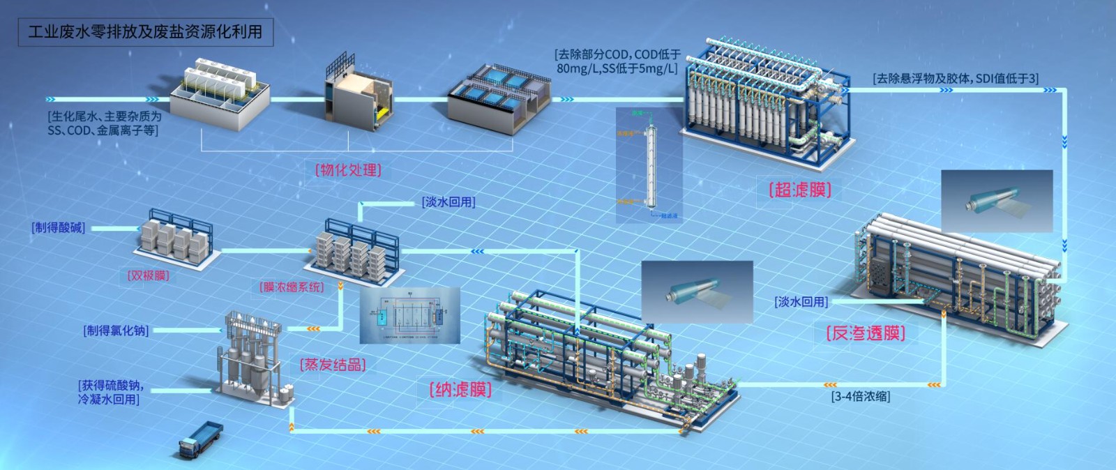 製漿、造紙廢水有機汙染物及無機鹽含量高、硬度高、成分複雜、處理難度大、成本高,公司自主研發了以膜集成為核心的零排放工藝技術,取得製漿造紙廢水治理領域的重大技術突破,實現了廢水全回用及廢鹽資源化利用的創舉。該技術獲得2019年度國家科技進步二等獎,並在王子造紙、玖龍紙業、亞太森博等大型企業得到廣泛應用,取得良好的經濟及環保效益。