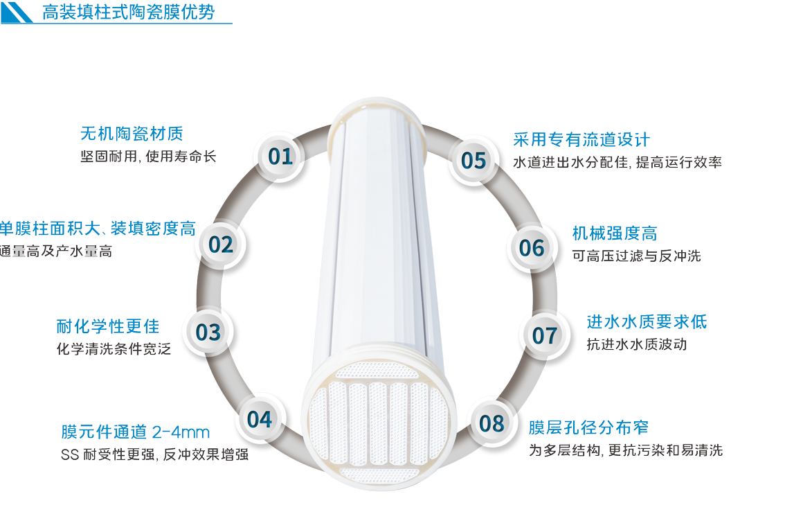 91香蕉视频在线播放高裝填柱式香蕉视频成人是在91香蕉视频在线播放傳統管式香蕉视频成人及平板式香蕉视频成人技術基礎上研製出的一款用於水處理的無機超濾膜。高裝填柱式香蕉视频成人是采用高強度α-Al2O3在高溫下焙燒製成,擁有良好的耐高溫性能,抗化學腐蝕性,優秀的機械強度。相對傳統多通道管式香蕉视频成人,高裝填柱式香蕉视频成人單支膜管過濾麵積可達 10-25 ㎡,擁有更大的裝填密度及處理能力,能夠有效去除固體懸浮物、細菌以及膠體等物質,可應用於民用安全用水、市政給水和廢水處理、應急供水、水回用、工業過程廢水等多個領域。